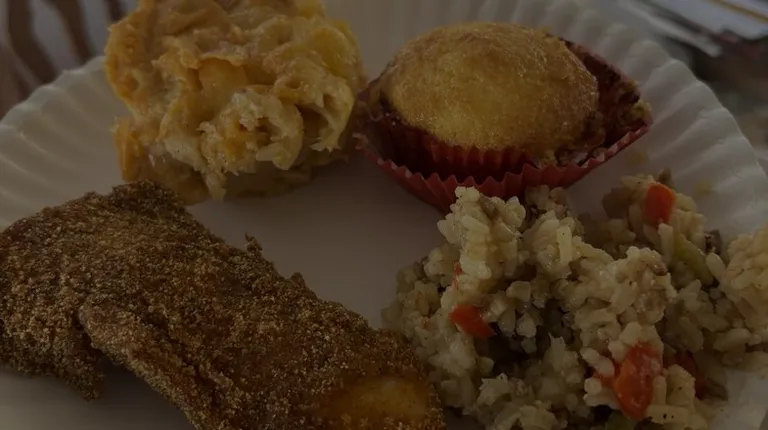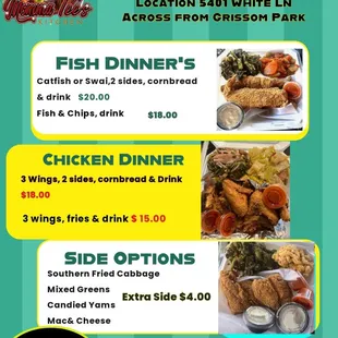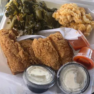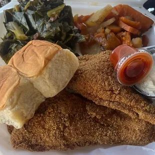 Catfish, Southern Fried Cabbage, Candied Yams, 2 rolls & Peach Cobbler