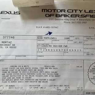 Repair Invoice from Winchester Transmission