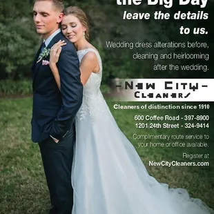 New City Cleaners was the ONLY cleaners in all of California that would clean/restore my grandmother's 65yr old silk wedding dress! And they did a phenomenal job! The dress had been sitting in a box unsealed all these years, still in mint condition; only needing a cleaning. The silk and hand sticked gold embroidery was all made to look good as new!Additionally, their alterations lady was able to modernize my dress by just providing her an inspiration picture and discussing what I wanted. The end result came out absolutely gorgeous! Not to mention how reasonable the cost was for everything! It meant so much to me to able to wear my grandmother's dress on my wedding day, thank you New City Cleaners!