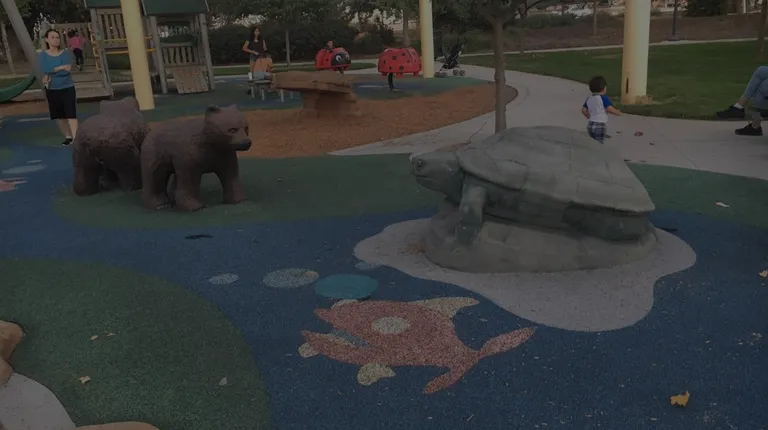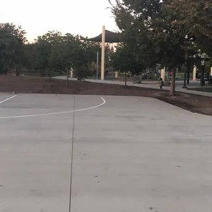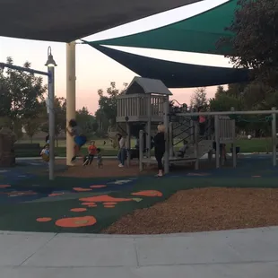 What an awesome family park tucked away from the busy streets! It has a huge field with a paved walkway around it for runners, bikers, roller skaters:)There are two play areas targeted for different age groups. It's even good for 1 year olds! The equipment is new and fun! There are climb on figures like bears and turtles. There's bark and foam/rubber ground, but no sand. While my kids are sand ADDICTS, they don't mind not having sand at this park because it's so fun.The playground is significantly shaded by overhead shades as well as trees. It's very well maintained. There's a drinking fountain, but no bathrooms. Very well lit at night. It has tables and benches with overhead awning that can be reserved for parties.There's half a basketball court. There's really something for everyone. Bring your dogs, bring the family, and have fun!