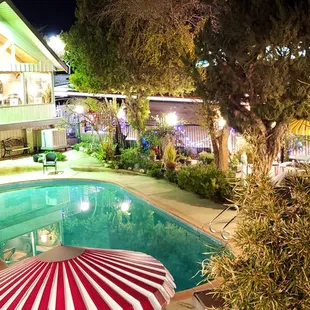 My husband reserved this and was 'not sure' I would want to stay in the only room available. . . at ground level. Both of us prefer second-story or higher locations at a motel. But as SOON as I walked into the room (#4), I was smitten. There is a palpable 'peace' here.It had everything we wanted; a CLEAN spotless room, coffee maker, fridge, microwave, peace and quiet, quality cotton sheets AND a mesmerizing 50s TIME WARP! Bottled water, and other treats were also available.There is a resident, skunk named 'Princess', who pals around with the local cats at night. She has never sprayed anyone (said the departing 'Music Club' members. . . they ought to know, right?). Then after being informed, the HIGHLIGHT of my stay, was IMMEDIATELY seeing her at the bottom of the stairs! When she caught me staring at her, she scampered under the pool fence & disappeared into the garden. . . Soooo cute! I would come back in a heartbeat. . . JUST to see Princess! ;)