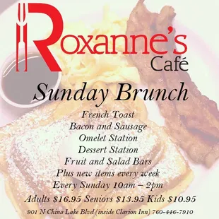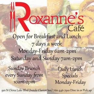 Today is Thanksgiving and we decided not to cook this year. So we were trying to decide where to go. The few places that were offering dine in; one was charging $23 per plate, drinks not included, while the other was $70 for four plates, drinks not included. One of them didn't even know what they were going to charge till the night before as we kept calling to find out. Roxanne's had a perfect advertisement, which mentioned all the details. They have a huge parking lot, so parking is easy to find. Roxanne's was $25 per person, all-you-can-eat, with free soda refill drinks and juices like Cranberry included in the price. They had a big selection of Thanksgiving favorites, full salad bar, customized omelette bar with all the extras, fried fish, bacon, fried chicken, corn on the cobb, and a whole table full of cakes, pies, cookies, and tarts. Not one employee had a bad attitude. Every employee was friendly, polite, competent and professional. They have cushioned booths, and tables. Their dining room is large with an open airy feeling with large windows with a good view of the surrounding mountains. The restaurant is newer and cleaner than the other restaurants. I'm usually quick to complain about bad products & services. Surprisingly, I had only one complaint as I ate way too much and left in pain. I love Roxanne's and will definitely be returning in the future. I highly recommend them. Thanks Roxanne's employees and manager! You made this Thanksgiving a wonderful day for us.