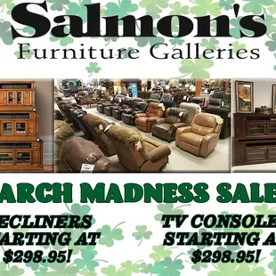 We have been shopping at Salmons for years. Our last purchase, which was a little over 3 years ago, we bought a Hancock and Moore leather couch and recliner. Very high-end furniture. Extremely pricey. One of the selling points was this brand had a "life-time" guarantee. Make sure you read the fine print on anything that says "life-time", no matter what the sales person says.By time February, March rolled around of this year, my husband's recliner had a huge hole worn in the neck/head area and the leather in this area was turning red. The color of the chair is brown.I took a photo of this and showed it to Salmon's personnel. They said they had only seen this happen one other time and it was blamed on medication that the person was ingesting. And they also said that Hancock and Moore would probably not cover the replacement cost.I stated that my husband does take medication, the same thyroid medication he has taken for over 35 years. He has had two other leather recliners in those years and did not wear a hole in them. I found that to be very bizarre. I also asked if there was a disclosure anywhere that stated that certain medications could affect the leather. There is not.So I was told that this complaint would be reviewed and they would get back to me. Which they did, and like I stated above, Hancock and Moore does not cover this type of damage. Wow, pay $3,600 for a chair and after having it just 3 years, a big hole is worn through and they won't replace it?But, Salmons said they would replace the leather this one time, but that we had to pay the service that would actually come to the house, take off the old leather and put on the new. This insulted me and I let them know I was not pleased with this arrangement. If this had been 10, 15 or 20 years later, I could understand it. But 3 years later, and having to expend any money whatsoever, I thought was just wrong. It was $85, which is minimal, but, Salmon's should have also covered this cost. Needless to say, they have lost a good customer.