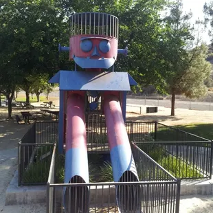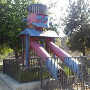 This has been a favorite park for years for everyone that's grown up in the area!They have big grassy area to run around and play. A basketball court, and they have 2 different park apparatuses for kids to play on. This is a sand park! There's one play structure for younger kids, and one for bigger kids. There's swings and bathrooms. Usually kept up pretty well, they have camp Clarita held here. This is the iconic robot park that people know!