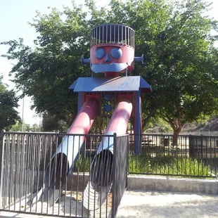 I love this little park!The've got bathrooms, swings, a little jungle gym slide, and the famous robot slide that you can now only ogle as there's an impenetrable fence around it now. Back in my kid days it wasn't there and I loved playing on it! I don't know why we can't play on it any more and why it's still there torturing everyone with its existence, look but can't touch.There's a basketball court, swimming pool, and baseball field here to enjoy as well. Lot's of open grass space to run around on and picnic tables if you wanna have a party or gathering here.Yay childhood!