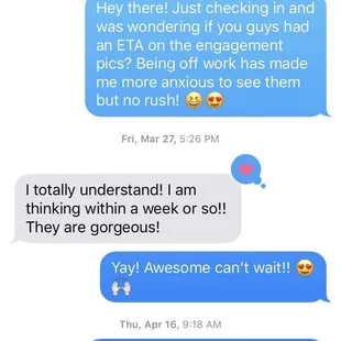 We have had a mostly negative experience with Scott Ryan Photography after hiring them as our wedding photographer. I am aware that most people won't read this entire review but I wanted to be as honest as possible. So if you only get this far, I would highly recommend that you pass on using this photographer for your wedding and continue looking. We had multiple extremely unprofessional interactions that we were willing to overlook until the final straw.My final decision to terminate this vendor was after we spoke to them about not posting our engagement pictures to social media until we had a chance to send out save-the-dates or invitations, which we have not been able to do due to Covid 19 and the inability to actively plan our wedding. Our pictures were posted to Instagram without a single word of communication. And we were having friends contacting us about the pictures when we wanted them to be kept private and released to family on our terms, as agreed by Courtney. Instead of taking responsibility for the lack of communication, the response I received was "so much time had past I believed I could post them. My mistake." To add insult to injury, we were also blocked on Instagram.Now to address the other issues beginning with our engagement shoot. The first red flag was a scheduling issue when they had put the wrong date down after we had a written text agreement of the date. Luckily, I had reached out to confirm and Courtney was able to fix it to the original date we agreed on. On the day of the shoot, Scott was upwards of 30 minutes late for our sunset shoot and we were not notified until I asked where he was, nor received even an apology at his time of arrival. He is a talented photographer and is very enjoyable to work with but in this situation, it was handled very unprofessionally. And then, it took 6 weeks to receive our pictures. After not hearing anything for 2 weeks after the shoot, I reached out for an ETA and was told "a week or so" which ended up being 4 weeks from that time (During these 4 weeks I had reached out a few more times to get a new ETA, sometimes with no response). And when we finally did receive them. They were of poor quality after trying to print them and took even more time to receive pictures that we could actually use. And, again, I had to reach out to them for an additional ETA. I was offered $100 off the total price for this issue, which was satisfactory until the pictures were posted without any communication. At that time, I requested a refund for the difference between our "deposit" and the services we actually received and they refused and stated "I'm sorry you feel that way."I, then, found out they never received a signed contract. They neglected to tell me they did not have a signed contract on file. When asked, they would not produce a copy of the contract that was signed by both parties for me and was told to stop contacting them. On their website they list their prices and I could see that the services we received (engagement session) were priced significantly lower than the money we gave them (a $300 difference). We asked for a refund of the difference and did not even bring up the $100 we were promised for the prior errors. They refused and suggested we take them to court... I contacted a mediator instead, they refused that as well and kept the $300 difference... again, WITHOUT a signed contract.The overall experience with Scott Ryan photography has been not only disappointing, but disrespectful as well. Their customer service and communication skills are lacking to say the least. I can't imagine what further issues we would have encountered if we allowed them to actually shoot our wedding. I would advise that you continue shopping instead of deciding to use this photographer for anything of importance. If you think of each of the stars as points of the interaction with a business, one star each representing important aspects of customer service: communication, timeliness, quality of customer service, knowledge of product, and quality of product (for example), then Scott Ryan Photography will receive one star at most from me for the talent of the photographer and ONLY that.I have decided to post screenshots to verify these encounters I have mentioned. I was friendly and flexible and gave them ample opportunities to correct the issues but clearly my kindness was taken for granted as the errors piled up.
