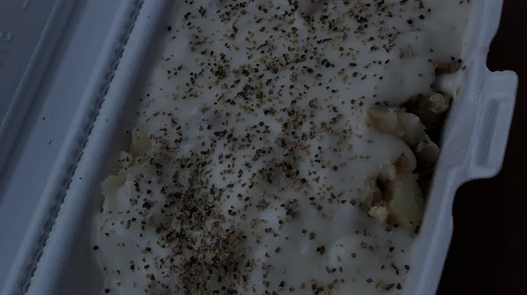 Biscuits and eggs covered in pepper, bacon and sausage gravy. Yumm.