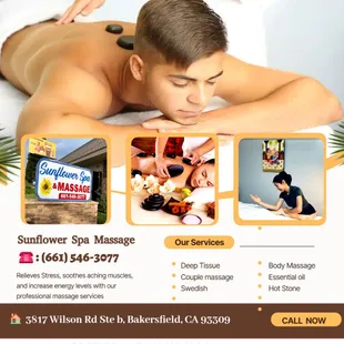 I had an amazing experience at Sunflower Spa! From the moment I walked in, I was greeted with a calming atmosphere and friendly staff. The massage was incredible--exactly what I needed. My therapist was attentive and skilled, leaving me feeling completely relaxed and renewed by the end of the session. I highly recommend Sunflower Spa for anyone looking to unwind and recharge!
