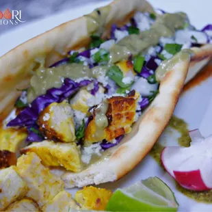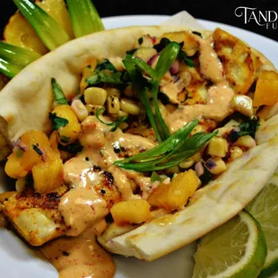 2 butter chicken naan tacos, 1 grilled shrimp naan taco, 1 tri-tip naan taco, and 1 tri-tip bowl