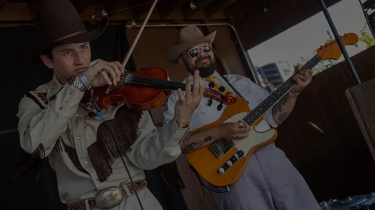 a group of men in cowboy costumes playing music