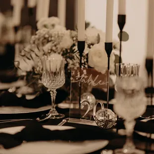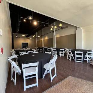 Seats up to 100 people and 180 total, we offer round tables with black linen, and white resin chairs.