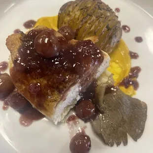 What didn't go well?!??Y'all, it was so freakin fantastic. We did the 6:00 seating and arrived at 5:50. They let us in (we were first) and sat us. You have potential at some point to share a table with others, especially if you are a 2 or 3 top party. Got waters right away. The menu (which we knew in advance during purchase) was our place setting. Food started coming out and was timed perfectly throughout the courses... took about an hour total for two of us - we did not do wine, although it looked amazing and I'm sure would pair perfectly with this food (both currently sober). I didn't get a picture of the first dish because I just wanted to enjoy everything but I loved it so much, I knew I would be doing a review. The first course had two types of mozzarella, prosciutto, pickled nectarine and a honey drizzle. Soooooooooo good. Probably our fav if we are totally honest. Second course was a salad with a grilled apricot, candied walnuts, and an oil based dressing. The peach really gave the flavor and made it a juicier like dressing. Make perfect bites with all ingredients. We both chose the duck which came on a bed of quinoa that I think had tarragon in it??? And a glaze with peaches. Again, ate a little of each with each bite and Suuuh good. I made the chef's kiss motion twice. Finally, for dessert a peach Melba.... Which is a peach that was torched to make a sugar crust, serve on vanilla bean ice cream with I think a strawberry type purée sauce with crumbs in it. *droooool** The ambiance was also wonderful. Perfectly lit, and the music was subtle and relaxing. I cannot say enough, how much we loved this!