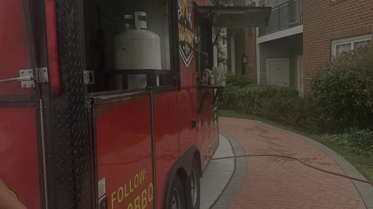 a truck and a food truck in a parking lot