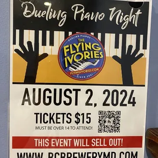 What a fun Valentine's night out with friends for a dueling piano show at BC Brewery. The Flying Ivories took the stage (and requests) for a two-hour non-stop dueling pianos show. So much fun! I would have given this a five-star review, but some things stood out that I can't ignore. Tickets were sold out and it was obvious at 6:15 when the line to get inside the brewery was stretched out into the parking lot. And it was cold out there! Once you got checked in at the welcome table and got your table number you had to get BACK in another line (also stretched outside into the parking lot) to order any food and beer. This meant a whole bunch of people missed the beginning of the show due to standing in long lines. We were able to get our beer and find our seats which were right up front - perfect! Then we waited about an hour before we got the text that our pizza was ready. The seats were crammed - way too crowded in there and most likely violating the fire code. The show was a blast though and the beer and pizza tasty. Definitely a fun night to remember.