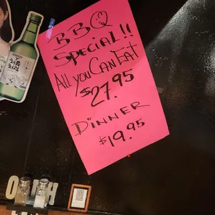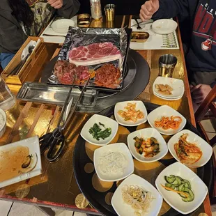 Came in for all-you-can-eat kbbq on a wednesday evening, during our 1.5 hours there, only one customer came in while we were dining.To start, the meal was $32.99 per person, after ordering a side of rice and tip - each person ended up paying about $50. The small sides came out first, it was a variety of things like kimchi. They also have you order a starter/larger side with the ayce meal, we were very confused when ordering however. Each person ordered something different, but some of the stuff was brought out for sharing and some for each individual person, would have been nice to know before ordering. The meats then began to come out, they were delicious, they just put a cookie pan on top of the table grill which I hadn't seen before, but it worked. Also although we were the only ones in the restaurant, there was a long wait time before each meat came out. This place had pretty good food, but the service and atmosphere were lacking
