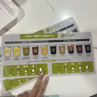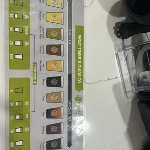 First Timer's Guide on tea strengths, with custimization of sugar and ice.