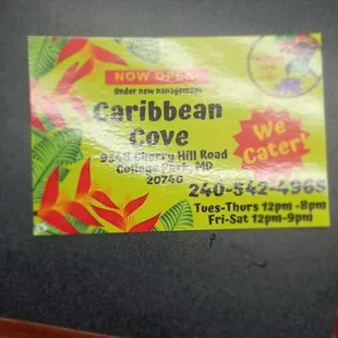 The sign on Cherry Hill Road still says Unforgettable Flavors and the Cove is in the same basement level nook in the 7 Springs apartment complex (look for the catering van parked at street level) but Chef Neville has moved up the road to Mad Cow. Had to see if the vibe remains.Same cozy space, deserted when I stopped in for a take out supper. Same collection of Caribbean soft drinks. Menu is pretty much the same. Jerk chicken, of course. Very generous portion for $10, and includes braised cabbage and nice moist rice & beans sides even though the menu doesn't mention that. The chicken is boneless chunks, and I didn't miss the splinters at all. Seasonings were complex with just enough scotch bonnet for a good scalp sweat but not punishingly hot.Food is not up to Chef Neville's brilliance, but very tasty and a good value. I'll be back.