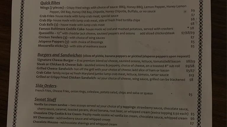 This place rocks, not only does it have a great bar for a couple of night caps it also has a great little menu for a late night snack, or some desert, which was what my party came in for.We came in just about five minutes before the food part closed, and Cathy the server could not have been nicer. She took our order for fries, strawberry cheese cake, and this warm chocolate cookie (which I had) with vanila ice cream, chocolate, and caramel sauce, with whipped cream on top, it was decadently good.It was the perfect ending for a great day at the Maryland Renaissance Faire.