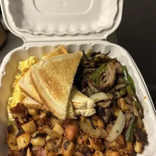 Breakfast platter: scrambled eggs, hash brown, pork sausage and toast.