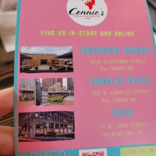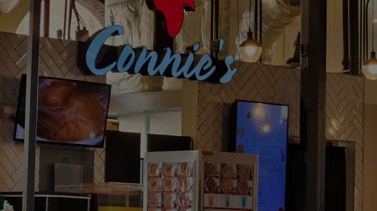 Located in the Broadway Market with a second Baltimore location and one in Wilmington, Connie's is all about two things: chicken and/or waffles.We arrived around noon on a Friday & didn't have plans to get food from here but the sweet waffle smell drew us in. Weren't busy but started to pick up. They have a kiosk available for self serve ordering.We ordered the Buttermilk Chicken and Waffles. Waffles were fluffy/airy and stole the show! Chicken was seasoned but just okay-didn't live up to the "award winning chicken box" billing. Noticed after they have various waffle flavors (Oreo, Crunch Berry...) so next time.Nothing stood out for Service- could've been engaging/upbeat but wasn't.Will be back to try other waffle flavors and see if it was just an off day for the chicken.