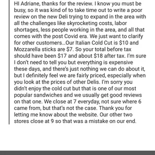 I left a review on google which was my honest opinion and the owner replied in a bit of a sarcastic manner instead of apologizing for my experience and trying to make it right the response was full of lies and excuses. One lie was that they close at 7pm well if that's the case the owner needs to clarify things with their staff I personally ask the lady behind the counter what time do the really close because I came the day before at 620pm and they were closed her response was since we no longer offer breakfast our hours are 10am until 6. I Understand the cost of food is high I also run a cafe in the area and the price of food shouldn't affect the quality and in case your wondering I have receipts of how much I was charged since the owner wanted to break down the prices. Do better next time I will insert the charge on my bank statement also my original review and the owners response.