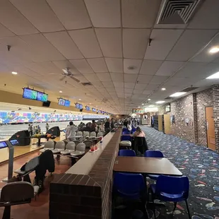 Scheduled a 2 hour slot got our shoes ordered drinks from the window on the side of the bar ( everyone in group must show ID ). Food isn't with it in my opinion at the snack bar but it was a good wholesome family time lots of room to spread out nice lanes plenty of things to do