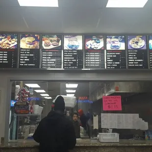 a man standing in front of a menu board