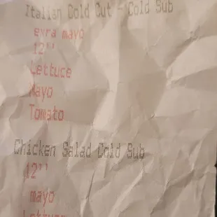 Not supposed to be onions on the Italian cold cut sub! Guess what. 86ed sub, it will still taste like onions, even if you remove onions. Rolls look like H&S Bakery. Who does that anymore?Afraid to check Chicken salad sub.