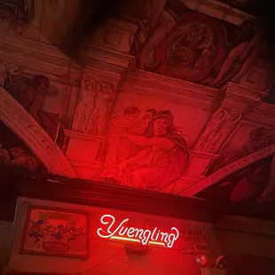 Baltimore you beautiful and charming city! Mount Royal Tavern was no exception! AKA the Dirt Church! We arrived on the bolt bus after 3 and 1/2 hours. Noticing that this super rad dive was already open made it an easy decision to get a breakfast beer. We dragged our bags and found the place. There was a fair amount of older fellas which is what I like to see when I walk into a dive bar. The surprise here was the hand painted ceiling of the Sistine Chapel. I've seen the real Sistine Chapel and let me tell you this was a great second choice. And now you get the nickname, Dirt Church. The bartender Ben Franklin was an absolute doll. He even gave us some bar swag, a business card you put on top of your drink if you need to leave it, a postcard and a sticker. My friend asked what the beer handle with the guy wearing a monocle was. The response from Franklin was "you're not from around there, huh?". Natty Boh is the Baltimore staple (National Bohemian Beer), it's cheap and light. We got a couple of Natty Boh's leaned back and relaxed. Some clients were relaxing more than others. Nap time. Thanks to the Dirt Church for the warm Baltimore welcome.