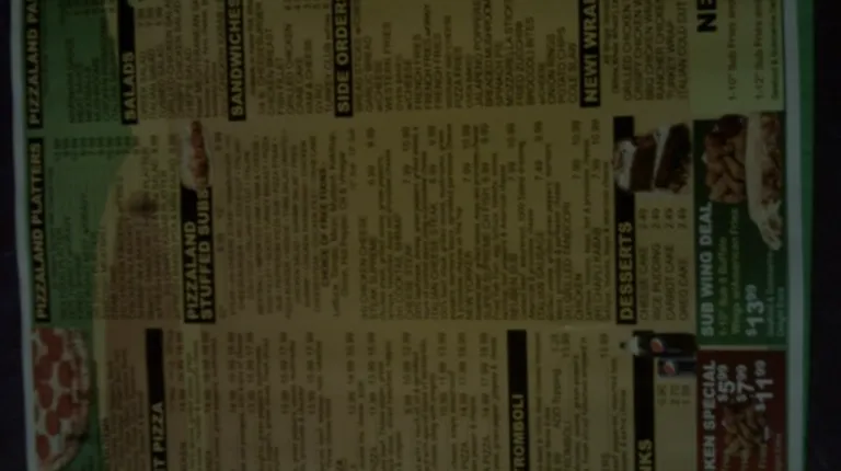 The Pizzaland sign on the side of the building as seen from the sidewalk on Wilkens Ave.