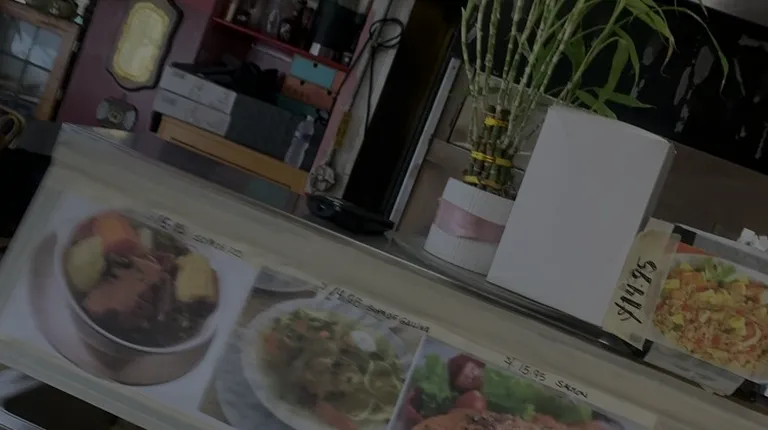 a restaurant counter with a variety of food items