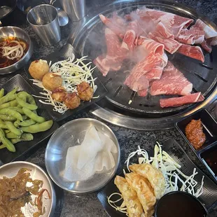 We wandered in here on a Friday night around 7pm after grabbing a bottle of wine nearby. The service was great, every employee was friendly and attentive.We were seated in a few minutes and took a look at the menu, which is pretty expansive! There are lots of meat options for the barbecue, but they also offer different dishes for those who don't want just BBQ or want an entree along with it. We did the special for two with five meats, and everything comes with little bowls of sides like kimchi, salad, and veggies. We also ordered a side of the egg soufflé. Everything was delicious, the service was great, and it was a fun, interactive dinner in a lowkey, laid back environment. Welcome to Canton, Steak N' Bone!