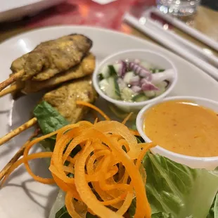 Shrimp pad Thai, Ka Pow chicken, pork and chicken skewers.