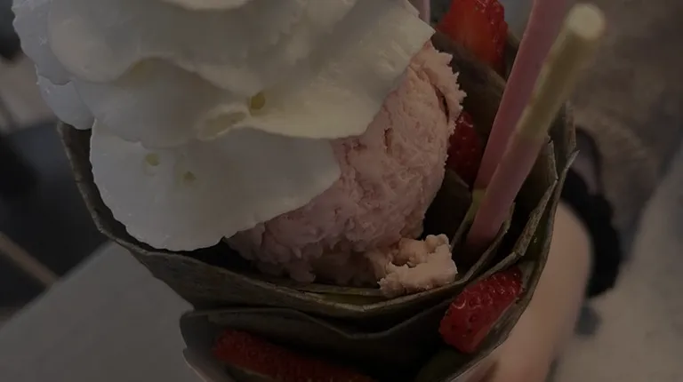 Beautiful presentation, but the actual product is mediocre and bland in taste. I've tried a crepe cone from here. It was disappointing. Today, I saw them take an ice cream scoop out of a bucket of dirty water, scoop ice cream with it, and place it back into the bucket of dirty water. This has to be some kind of health code or sanitation violation. Needless to say, as pretty as this looks, seeing that put a damper on things, and I will not be drinking this. This joint may need to be investigated and possibly shut down.