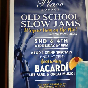 While the music is good, the wait on service at the bar is horrible. 2 for 1 drinks until 6:30 pm. Waited 30 minutes just to get one drink. Free food provided throughout the week, however, mac and cheese was too salty last night. Limited seating