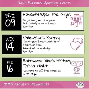 Visited This cafe again today. My husband and I had chocolate chip cookies. I had a mocha moose and a cappuccino. The staff was very friendly and we got to talk to Zoe and her family as well as other employees. They have speed dating event coming up in April. Last night they had karaoke.