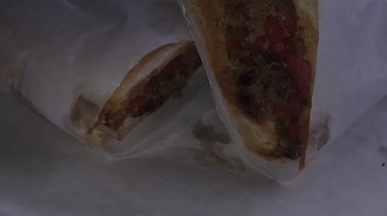 Full Monty - Steak, bacon, provolone, BBQ sauce (added fried onions, fried peppers, and 3 scrambled eggs) - half of a large sub