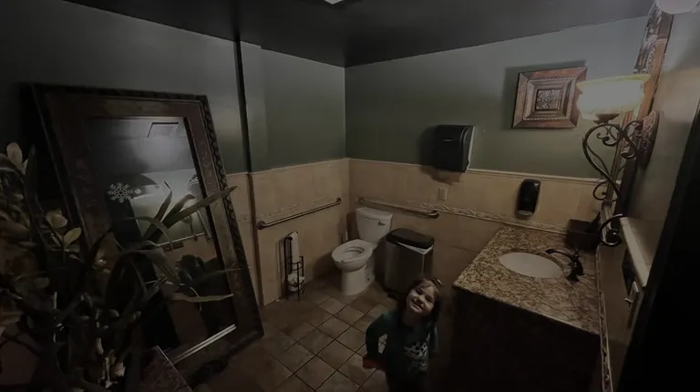 Women's Bathroom- Seat and Table, Full Sized Leaning Mirror, Beautiful Sink, Vanity Mirror, Sconces. Clean and well kept.