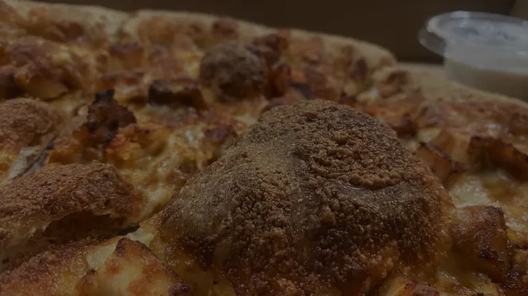 Love the sun burn pizza. My go to option!It's a white pizza, buffalo chicken cutlet, bacon & jalapeño peppers finished with ranch dressing on top. The buffalo sauce is just about right!