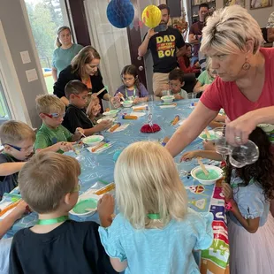 Held my daughter's 7th birthday party here and all the kids loved it! Dawn customized a party package around dragons and the range of kids from age 4-10 all enjoyed themselves. Each kid did a hands on experiment which the result of they got to take home as a party favor. In this case it was dragon snot, dragon food, and dragon medicine. Each experiment was preceded by a short demonstration and explanation of the science behind it, and despite being educational it was fun and kept even the youngest child's attention. Dawn and her assistant handled everything from the entertainment to serving the cake to cleaning up and packing up the party favors. It was easy, fun, and educational. Highly recommended!