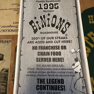 Menu for Roadhouse.