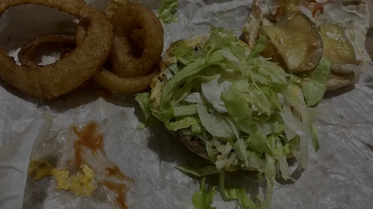 CharBurger opened up - lot of lettuce in there - orange drink is mostly off screen