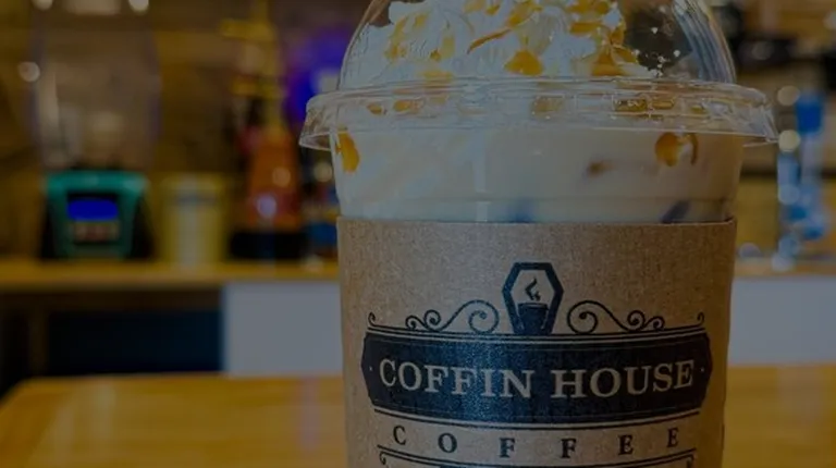 Maybe it's just me, but I am always looking for spooky things to do, no matter what time of year it is. I saw a friend post about Coffin House Coffee and I was instantly intrigued. A coffee shop in a funeral home?! Tell me more.So, Coffin House Coffee is located in the back side of Hartsell Funeral Home. It has a separate entrance and everything, but there is a glass doorway leading from the coffee shop to the inside of the funeral home, and they share a bathroom. Cheeky, right?They really played to the coffin theme, which I loved! Coffin rugs, a large coffin hanging behind the counter, and all the drink names are delightfully macabre. Lighthearted and fun, but still gives you the slightly morbid rouse you're seeking. The drink I ordered was the Coach, which was a peanut butter and jelly flavored latte. They use Torani syrups here. The first sip I wasn't sure, but the more I drank it and the flavors mixed, it was unique and I really enjoyed it! My mom got the Craftsman, which was almond cupcake flavor and it definitely tasted like an almond cupcake!I felt the service could've been a bit friendlier, but it wasn't bad by any means. This place definitely shines with its unique concept and niche theme!