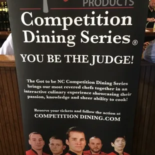 Competition Dining is so much fun! I've been to three times and plan on attending many more. Tasting the different dishes prepared by the chefs is a treat in itself; getting to score them like the judges do on Iron Chef and Chopped is a blast! The atmosphere is lively and engaged and adds to the fun of tasting and judging the six courses prepared by the local chefs using local ingredients.