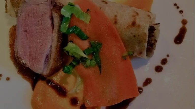 Second course by Heirloom Restaurant - Roasted lamb, radish, farro verde, foie gras vinaigrette, offal jus