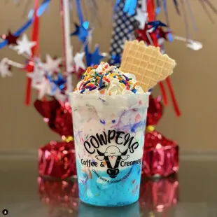 Small town with big coffee vibes. My GPS detoured me through Cowpens. Who knew in Cowpens, in this barely nondescript building there was a WHOLE VIBE... and the best vibe... a coffee vibe. Ain't God good???? I am a coffee snob. I don't like the taste of water in my coffee nor do I want regular coffee... I want plentiful shots of espresso, I want flavor, I want foam and I want variety. And in this little town of Cowpens, that's exactly what I got, along with some of the friendliest gals, eager to tell me all about the establishment. Super cute, super clean, super nice. I thank my GPS, for leading me into the boonies.They sell all things dairy. I saw ice cream, I saw shakes and i saw lots of varieties of coffee drinks. The prices are reasonable and they have a comfortable space to meet, mingle or work. I ordered an iced white mocha macchiato. It was as good as it was pretty and gave me the jolt of caffeine that I needed! So happy to find this hidden treasure! If you go looking it's a brick building with screen printed doors of a cow. It's in front of the gun shop but don't let that scare you.