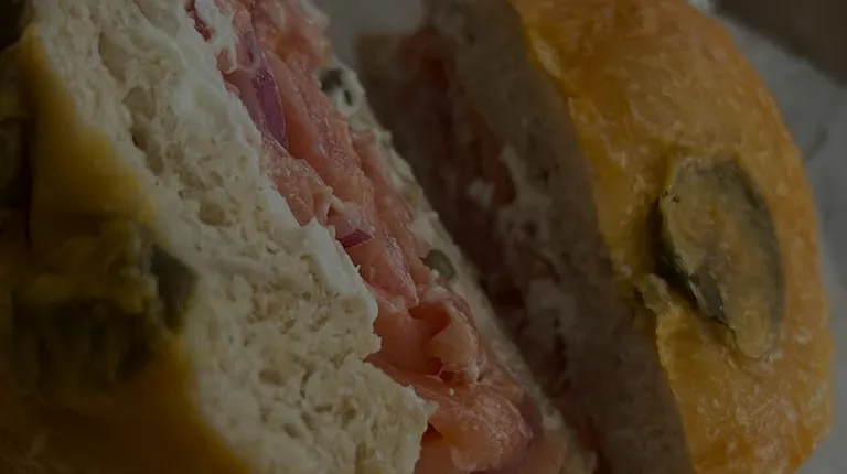 Sausage, egg, and cheese on a cheddar jalapeño bagel