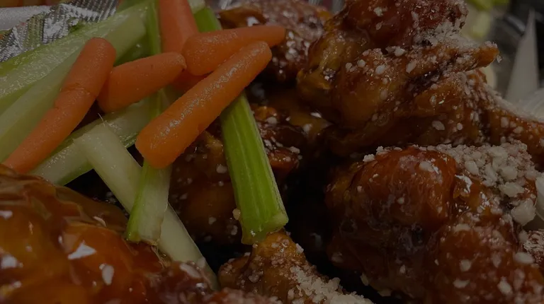 a plate of barbecued wings and a drink