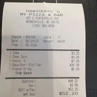 While we were in town visiting my mom today we decided to have dinner at Hawthorne's. Upon entering, I noticed that the restaurant was very clea. We were promptly greeted and seated. Throughout our experience, our server was very attentive and friendly. All of the employees appeared to work as a team.We started with the garlic knots. We have had a lot of garlic knots in a lot of authentic Italian restaurants and my husband and I both agreed that these may be the BEST garlic knots we have ever had! Soft, buttery & flavorful with the perfect amount of light crispness on the bottom. They were so good - I probably could have eaten all 6 myself.I can't remember the name of the pizza we had - Crew something. It was a great combination pizza - meatballs, sausage, pepperoncini (we held the onions). We also had an antipasto salad which was amazing (so fresh). My mom had a grilled chicken sub that she enjoyed. It was equivalent to two large sandwiches and paired with a fresh side salad.I REALLY wanted to try the cannolis, but my full belly didn't permit. I'll definitely save room next time!Without a doubt we will be making this a regular stop when we are in Mooresville! GREAT FOOD & GREAT SERVICE