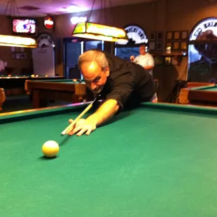 Yes! Pool hall dive bar! Definitely don't have too many of these in the surrounding areas in the least. Luckily I stumbled on to this place via the Yelp app and had a friggin great time hanging here with some interesting people. Good crowd. POOL TABLES GALORE... a dozen maybe..? They do have food and it looks ok for not having much of a kitchen or cook staff. Makes for a good 4th meal. Drink specials everyday I'm pretty sure. This IS the place to hang out and knock em back over some fresh pool. They have a shot club where they dictate a particular shot for 50(?) shots, and you get some prize. Not sure. In any case, pool is modestly priced. Tourney play is every now and then and that takes priority over walk-ins, unless there is an open table. Watch out for the sharks! They're out here!